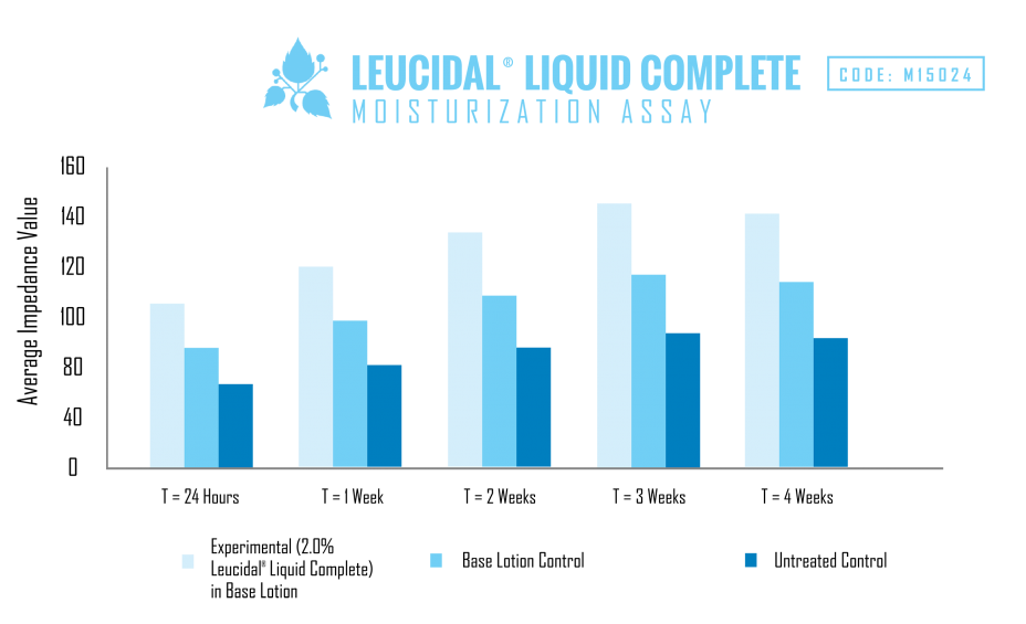 A skin moisturization study was performed using an untreated control, generic cream base, and an experimental with the same cream base containing 2.0% Leucidal® Liquid Complete. Comparative moisturization results from this study reveal that the addition of 2.0% Leucidal® Liquid Complete improved moisture levels by 42.01% after 24 hours and by 62.33% after four weeks when compared to the untreated control. When compared to the base cream Leucidal® Liquid Complete improved moisturization by 14.38% and after 24 hours and by 24.13% after four weeks. Based on these results, adding this innovative product provides the formulator the opportunity to capitalize on both the natural antimicrobial properties of Leucidal® Liquid Complete, as well as its ability to provide potent moisturizing bene ts to the cosmetic formulation. These properties make it ideal for applications addressing numerous skin and scalp conditions.
