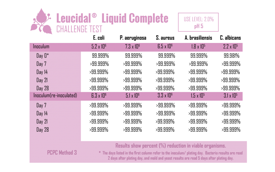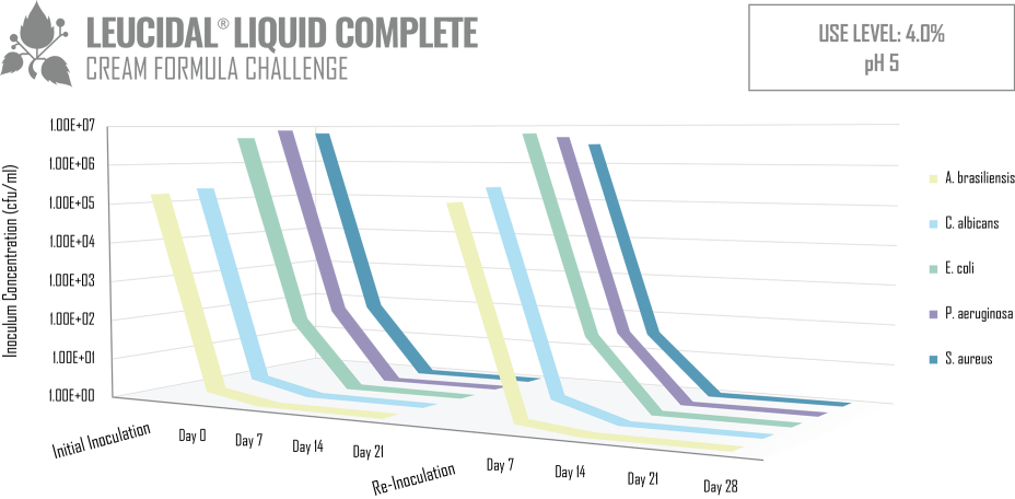 The positive MIC screening results warranted further testing to confirm its ability to provide product preservation. A Double Challenge Test was completed using 2.0% Leucidal® Liquid Complete in a generic cream base formulation. Samples were inoculated with E. coli, P. aeruginosa, S. aureus, C. albicans, and A. brasiliensis. During the first 28-day incubation period, samples were periodically collected and tested for the presence of these microorganisms. Following this initial 28 days of incubation, the cream samples were then re-inoculated with the microbial cultures and sampled over an additional 28-day period.