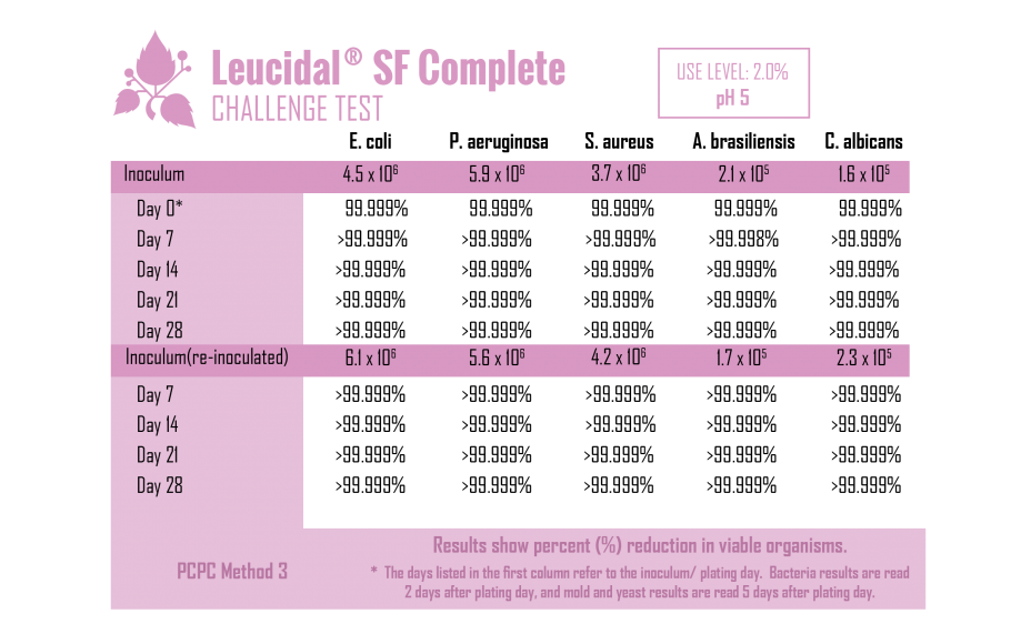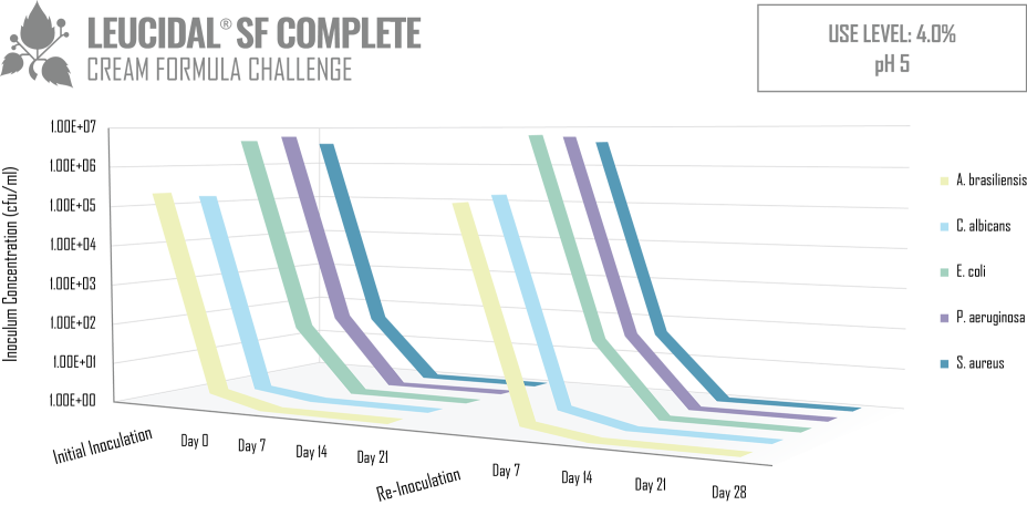 The positive MIC screening results warranted further testing to confirm its ability to provide product preservation. A Double Challenge Test was completed using 2.0% Leucidal® SF Complete in a generic cream base formulation. Samples were inoculated with E. coli, P. aeruginosa, S. aureus, C. albicans, and A. brasiliensis. During the first 28-day incubation period, samples were periodically collected and tested for the presence of these microorganisms. Following this initial 28 days of incubation, the cream samples were then re-inoculated with the microbial cultures and sampled over an additional 28-day period.