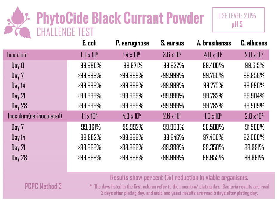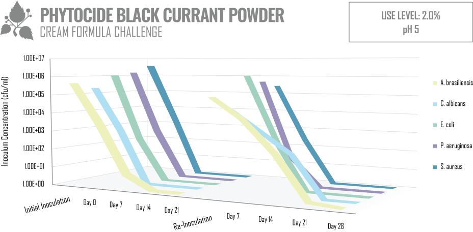 A double challenge test using 2% PhytoCide Black Currant Powder was also conducted to evaluate the ability of the product to provide antimicrobial protection in cosmetic finished products. A basic O/W emulsion was used as the base. The samples were inoculated with E. coli, P. aeruginosa, S. aureus, C. albicans and A. brasiliensis and incubated for 28 days. During this period, samples were periodically collected and tested for the presence of viable microorganisms. Following the initial 28 days of incubation, the samples were re- inoculated with the microbial cultures for another period of 28 days.