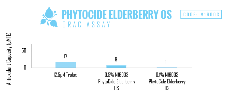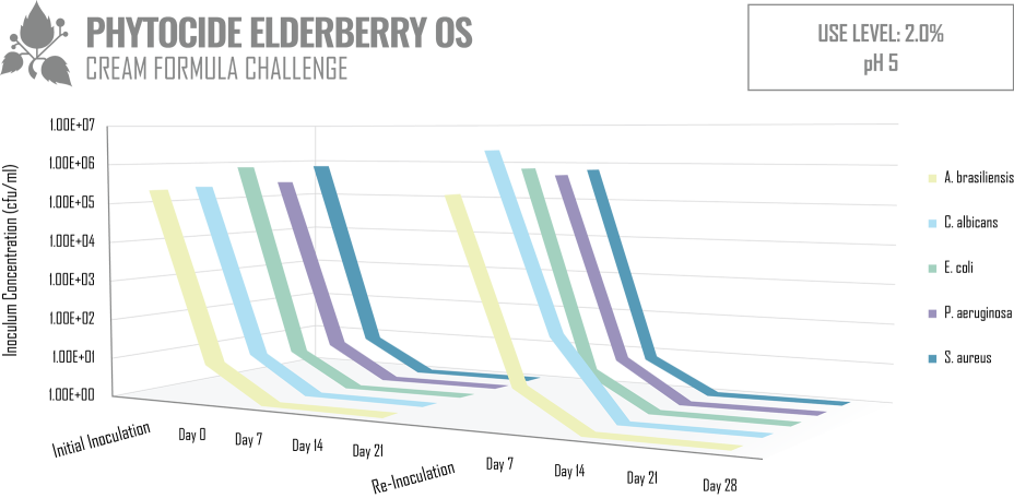 A Double Challenge test against Gram(+) and Gram(-) bacteria, as well as yeast and mold was completed to further elucidate the broad antimicrobial efficacy of PhytoCide Elderberry OS.