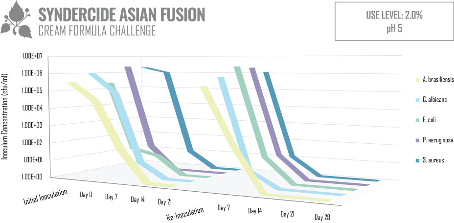 Synercide Asian Fusion is useful in a variety of cosmetic and personal care applications as testing has revealed that it is a broad spectrum antimicrobial. In Minimum Inhibitory Concentration testing, the results reveal effective performance. A Double Challenge study confirmed that Synercide Asian Fusion is effective against Gram (+) and Gram (-) bacteria, as well as yeast and mold.